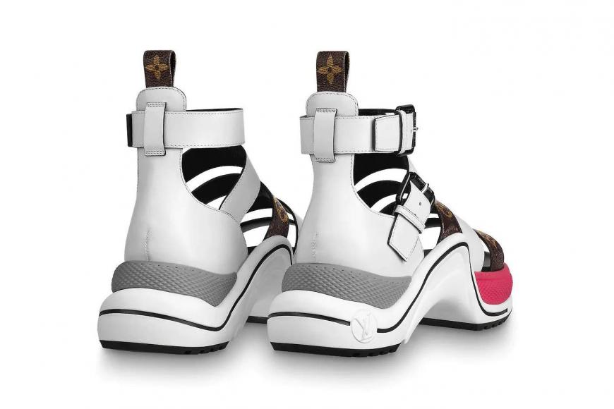 Odajući poštu Archlight modelu patika, nove Archlight sandale imaju četiri kožna kaiša sa promenljivim dezenom LV monograma i bele boje na svakoj površini. Živahni akcenti roze boje krase njiho prednji deo.