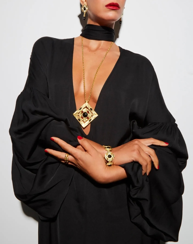 Nikol Riči ističe da je cilj bio stvaranje nakita sa namerom – komada koji se žive, a ne samo nose. „Nakit treba da bude talisman. Nešto što vas podržava, odražava i raste sa vama.“ Kampanja savršeno prenosi ovu filozofiju: Nikol u elegantnoj tamnosivoj svilene bluzi sa dubokim izrezom nosi masivni privezak iz Nova kolekcije od 14K zlata sa oniksom u centru i delikatnim pavé dijamantima, uparena sa crnim pantalonama, minimalističkim zlatnim minđušama i niskim punđom, kombinujući diskretni glamur sa promišljenim dizajnom. U drugoj sceni nosi slojevite narukvice i upečatljivo prstenje, gde je svaki dragulj odabran po značenju, a komadi dizajnirani za slojevito nošenje i svakodnevnu upotrebu.