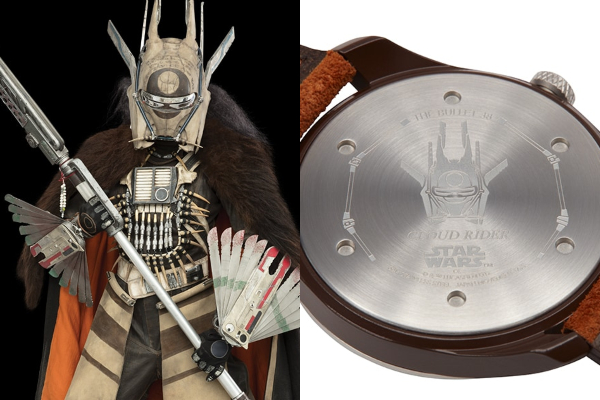Izuzetno opasan pljačkaš i lider piratskih jahača poznatih kao Cloud-Riders, Enfys Nest stekao je brutalnu i nepristojnu reputaciju u galaksiji. Sat poseduje detalje oklopa filmskog junaka na kazaljkama za sate i minute kao i guilloche brojčanik. Narukvica sata je izrađena od kvalitetne braon Saffiano kože sa detaljima koji jasno asociraju na filmski lik.