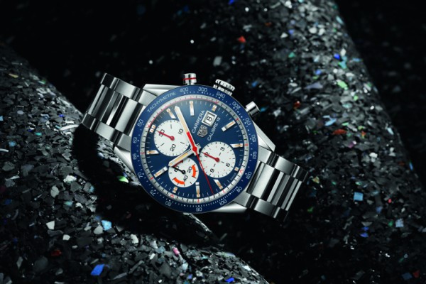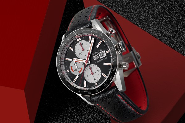 TAG Heuer Carrera Caliber 16, hronograf sa prečnikom kućišta od 41mm je crna verzija sata sa crnom kožnom narukvicom, a dostupna je i plava verzija sata sa čeličnom narukvicom. Sa elementima crvene boje, kontrastima i položajima brojača, jasne su reference na auto moto sport.