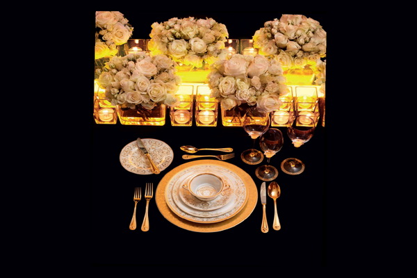 Inspirisan ambijentom raskošnih večernjih prijema, dizajn replicira tradicionalne Versaće motive: glavu Meduze i kompleksne barokne elemente dodajući uzbudljiv kontrast bele i zlatne boje, kako bi stvorio savremenu postavku stola. U ovoj kolekciji prepoznatljivi Versaće simboli bivaju utišani kombinacijama nežnih nijansi boja, tako da ne ostavljaju ravnodušnim ni one koji nisu poklonici snažnih valera jarkih boja kojima obiluju prethodne kolekcije.