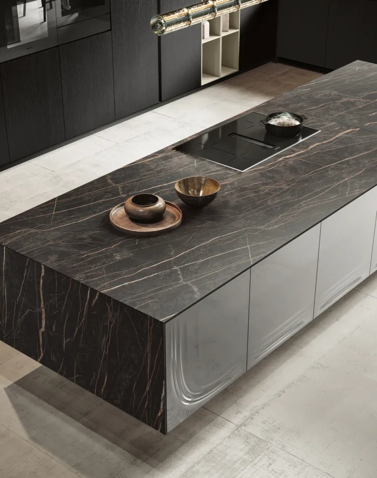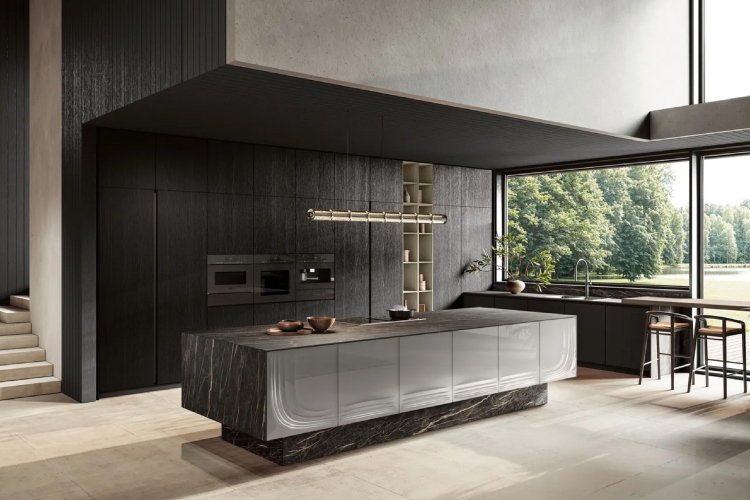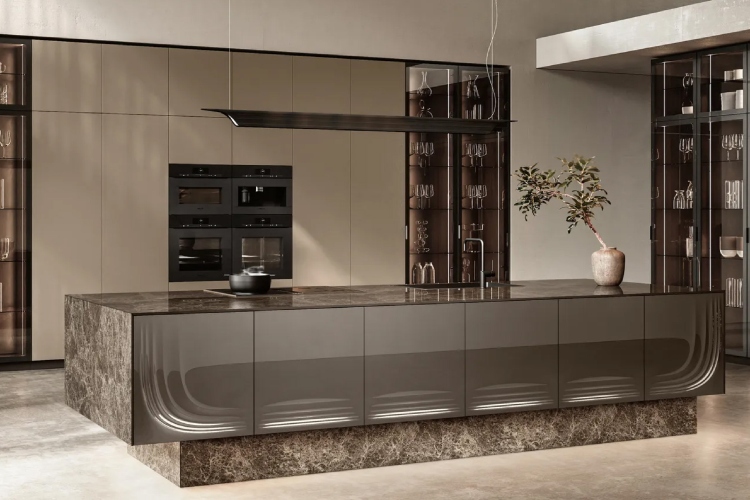 Kuhinjsko ostrvo „Onda“ osmišljeno je kao centralni element prostora – dužina se prilagođava, dok je dubina standardna. U opcijama su integrisana ploča za kuvanje, aspirator, sudopera, kao i moduli sa fiokama, policama i pametnim skladišnim rešenjima. Vitrina iz iste kolekcije, sa aluminijumskim ramom i staklenim policama od ultra-bistrog stakla, unosi lakoću i prozračnost, evocirajući blistave površine mora.