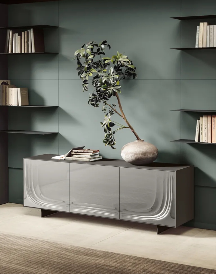 Kolekcija se sastoji od impozantnog kuhinjskog ostrva i elegantne vitrine, oba komada sa skulpturalnim linijama koje deluju gotovo fluidno, kao da su ih oblikovali talasi. Površine glatke poput stakla i metalik završne obrade u tonovima Bronze ili Champagne stvaraju osećaj luksuza, dok pažljivo izbalansirani kontrasti tamne palete i svetlih detalja unose dinamiku i prefinjenost.