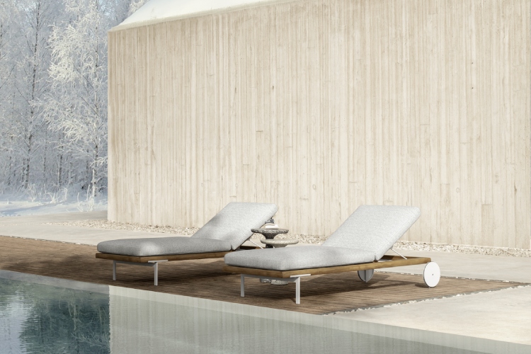 Sunbed Allure, potpis Kristofa Pileta, spaja modernu jednostavnost i nežne linije, dok drveni okvir skladno prati tkanu presvlaku, naglašavajući sofisticiranu prirodnu paletu materijala.