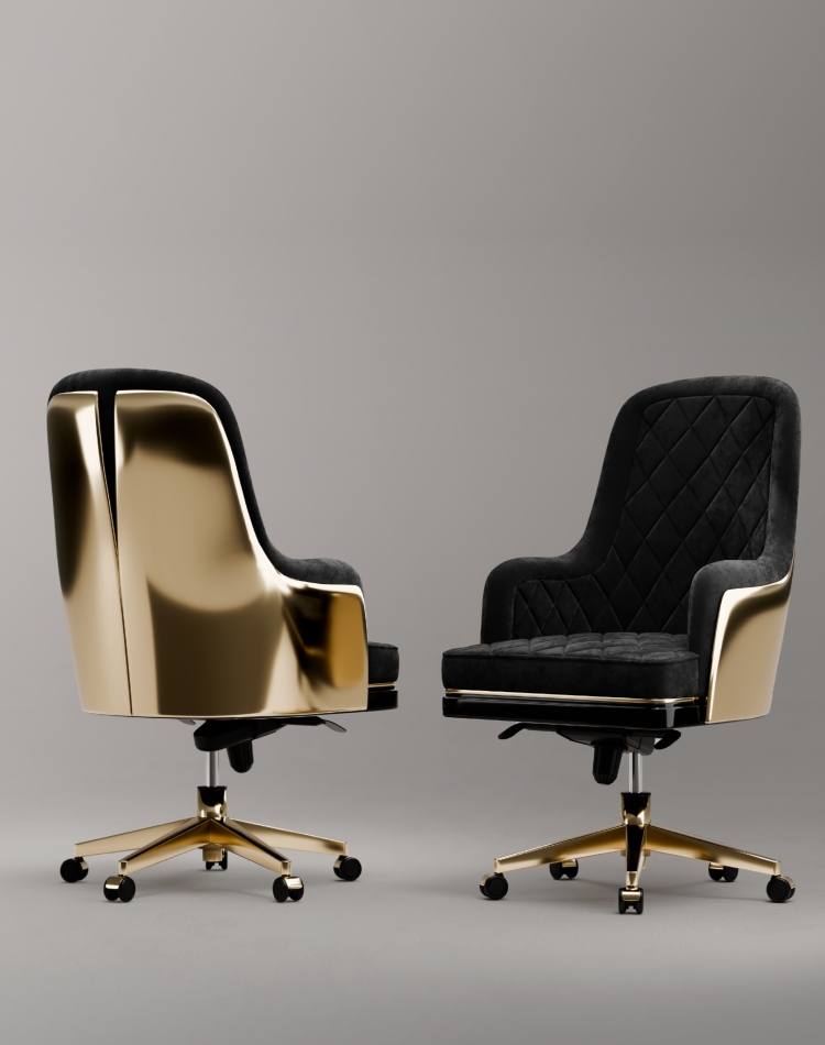 Charla Gold Office Chair uvodi sofisticiranu eleganciju u radni prostor. Presvučena premium crnim baršunom sa prošivenim detaljima, poseduje oblikovan naslon od mesinga i ergonomske naslone za ruke koji osiguravaju udobnost tokom dugih sati rada. Kombinacija luksuznih materijala i ergonomskog dizajna čini je savršenim izborom za prestižne kancelarije i radne zone.