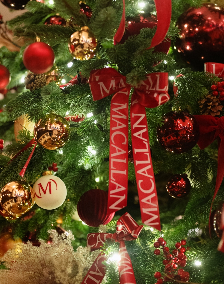 Jelka visoka impresivnih 7 metara osmišljena je u saradnji sa studiom Grandirosa, a inspiraciju crpi iz pejzaža škotskog Speysidea i prepoznatljivog karaktera destilerije The Macallan. Obučena je u plišane mašne u kultnoj Macallan crvenoj boji, koje prostoru daju topao, bogat sjaj – prazničan, ali nikad preteran. Kroz grane diskretno blistaju bakarne kugle, elegantna aluzija na čuvene bakarne kazane brenda, dok se među njima kriju bele dekoracije sa suptilnim “M” potpisom. Bobice, žirevi i prirodno lišće diskretno prizivaju škotski pejzaž, balansirajući savršeno između nasleđa i savremenog luksuza.